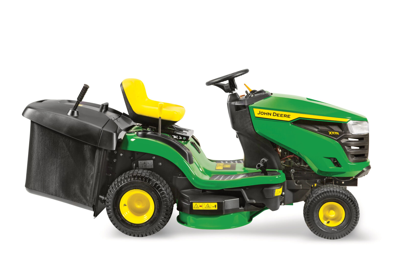 John Deere X117R – záhradný traktor so zberným košom pre pohodlné kosenie menších a stredne veľkých plôch