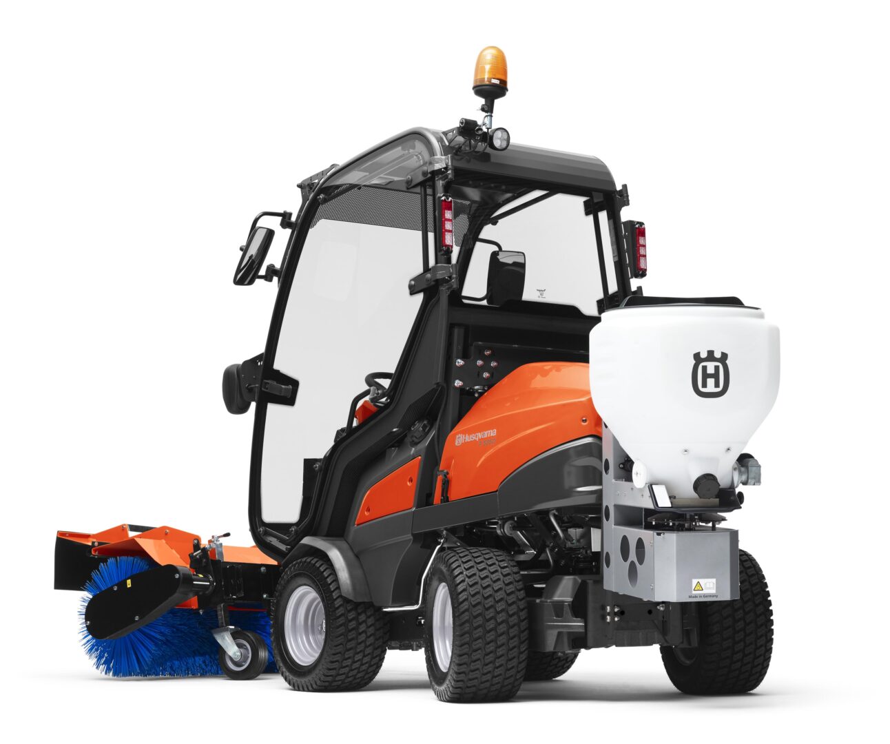 Vysoko kvalitné rozmetadlo pre profesionálne použitie. Možno využiť pre rozmetanie soli, piesku, štrku, pevného hnojiva alebo osív s veľkosťou zŕn až 6 mm. Dodávané ako komplet vr. káblov, ovládacieho panelu a závesov na uchytenie. Všetky funkcie sú ovládané z panelu u sedadla obsluhy – zapnutie/vypnutie rozmetacieho disku, otvorenie/zatvorenie posuvníka a bezstupňové nastavenie rýchlosti disku (80 – 600 ot./min). Bezstupňové nastavenie dávkovania pomocou posuvníka na rozmetadle. Pri otváraní kapoty ridera sa rozmetadlo ľahko sklopí dozadu. Zásobník s drenážou zvyškového materiálu. Všetky kovové časti ako rám, posuvník a rozmetávací disk sú vyrobené z kvalitnej nerezovej ocele. Špeciálna vodeodolná technológia miešača pre rovnomerný prietok sypaných materiálov.